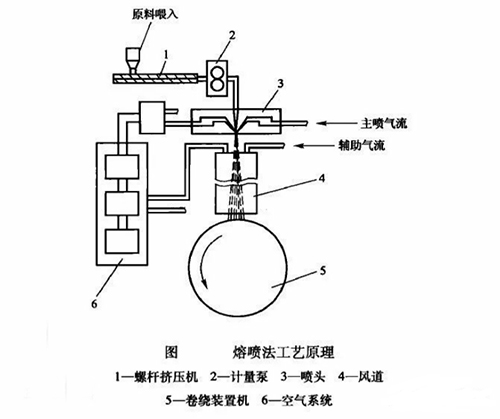 熔噴法生成的無紡布纖維更細,表面積更大,具有更好的過濾性、屏蔽性、絕熱性和吸油性,這些是其他工藝生產的無紡布所不能比擬的。下圖為熔噴法工藝生產熔噴布原理圖。