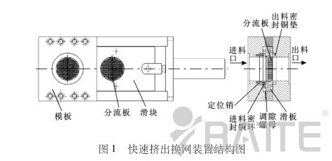 板式換網(wǎng)器結(jié)構(gòu):它主要過(guò)濾部件由滑塊、定位銷、進(jìn)料密封銅環(huán)、調(diào)隙螺母、分流板和出料密封銅墊所組成,如圖1所示。調(diào)隙螺母主要作用是通過(guò)旋轉(zhuǎn)調(diào)節(jié),將進(jìn)料密封銅環(huán)和滑板一端作密封緊配合,防止塑料溶液從進(jìn)料密封銅環(huán)和滑板之間漏出;塑料溶液通過(guò)分流板進(jìn)行過(guò)濾,過(guò)濾后的塑料溶液通過(guò)出料口流出。