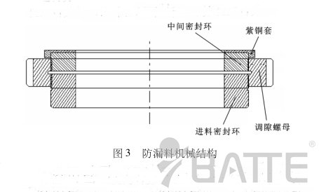 造成板式換網(wǎng)器密封處漏料原因:由圖1不難看出,在進(jìn)料密封環(huán)通過(guò)調(diào)隙螺母與滑板緊密配合的情況下,進(jìn)料密封銅環(huán)的另一端會(huì)和進(jìn)料口的底端面分離,即產(chǎn)生一定的間隙。在這種情況下,要想真正不漏料,只有進(jìn)料密封銅環(huán)的外徑和進(jìn)料密封銅環(huán)放置槽的配合精度很高才行。但事實(shí)上,在加工中,由于加工誤差的原因,這種高配合是很難做到的,這時(shí)就會(huì)出現(xiàn)如圖2所示的現(xiàn)象,會(huì)產(chǎn)生微小的相對(duì)配合間隙。由圖2不難看出,當(dāng)塑料溶液受到的壓力稍大時(shí)就會(huì)從產(chǎn)生的間隙中漏出來(lái)。